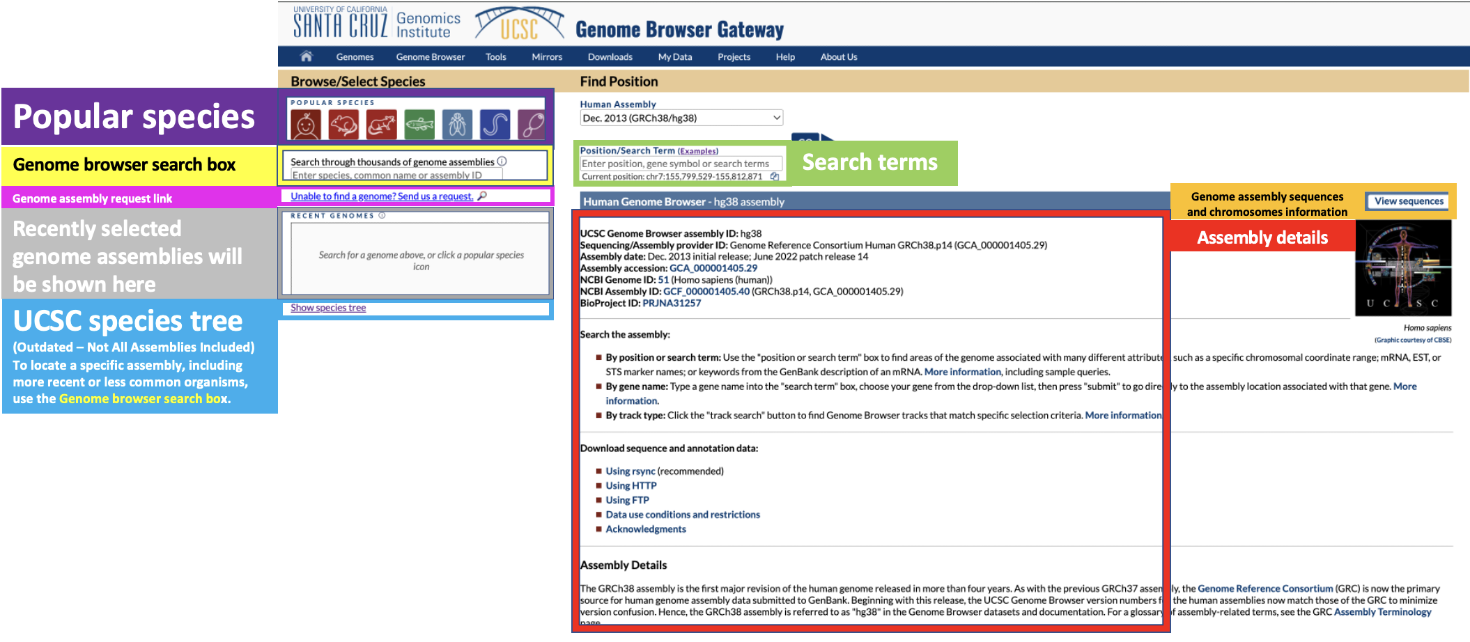 The UCSC Genome Browser Gateway page is a tool for finding and accessing genome assemblies. It features two search boxes: one for selecting an assembly and another for specifying a genomic position. This tutorial will guide you through various features of the Gateway page, including: